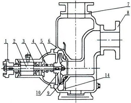 CYZ-A型自吸油泵均采用軸向回液的泵體結構。泵體由吸人室、儲液室、渦卷室、回液孔、氣液分離室等組成,泵正常起動后,葉輪將吸人室所存的液體及吸人管路中的空氣一起吸人,并在葉輪內得以完全混合,在離心力的作用下,液體夾帶著氣體向渦卷室外緣流動,在葉輪的外緣上形成有一定厚度的白色泡沫帶及高速旋轉液環(huán)。氣液混合體通過擴散管進入氣液分離室。此時,由于流速突然降低,較輕的氣體從混合氣液中被分離出來,氣體通過泵體吐出口繼續(xù)上升排出。脫氣后的液體回到儲液室,并由回流孔再次進入葉輪,與輪內部從吸人管路中吸人的氣體再次混合,在高速旋轉的葉輪作用下,又流向葉輪外緣……。隨著這個過程周而復始地進行下去,吸人管足各中的空氣不斷減少,直到吸盡氣體,完成自吸過程,泵便投入正常作業(yè)。因為該泵具有這種獨特的排氣能力,所以此泵能輸送含有氣體的液體,無需安裝底閥,使用在油輪上時具有良好的掃艙功能。